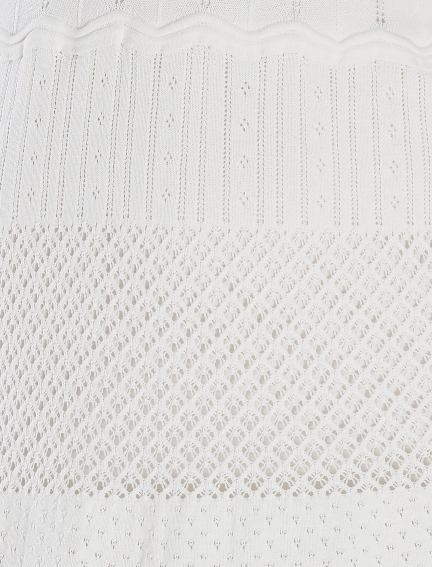 Midi dress cut from a mix stitch pointelle knit. Done with a surplice V-neck in a pullover fit-and-flare silhouette. Finished with a fluted hem for a feminine look.