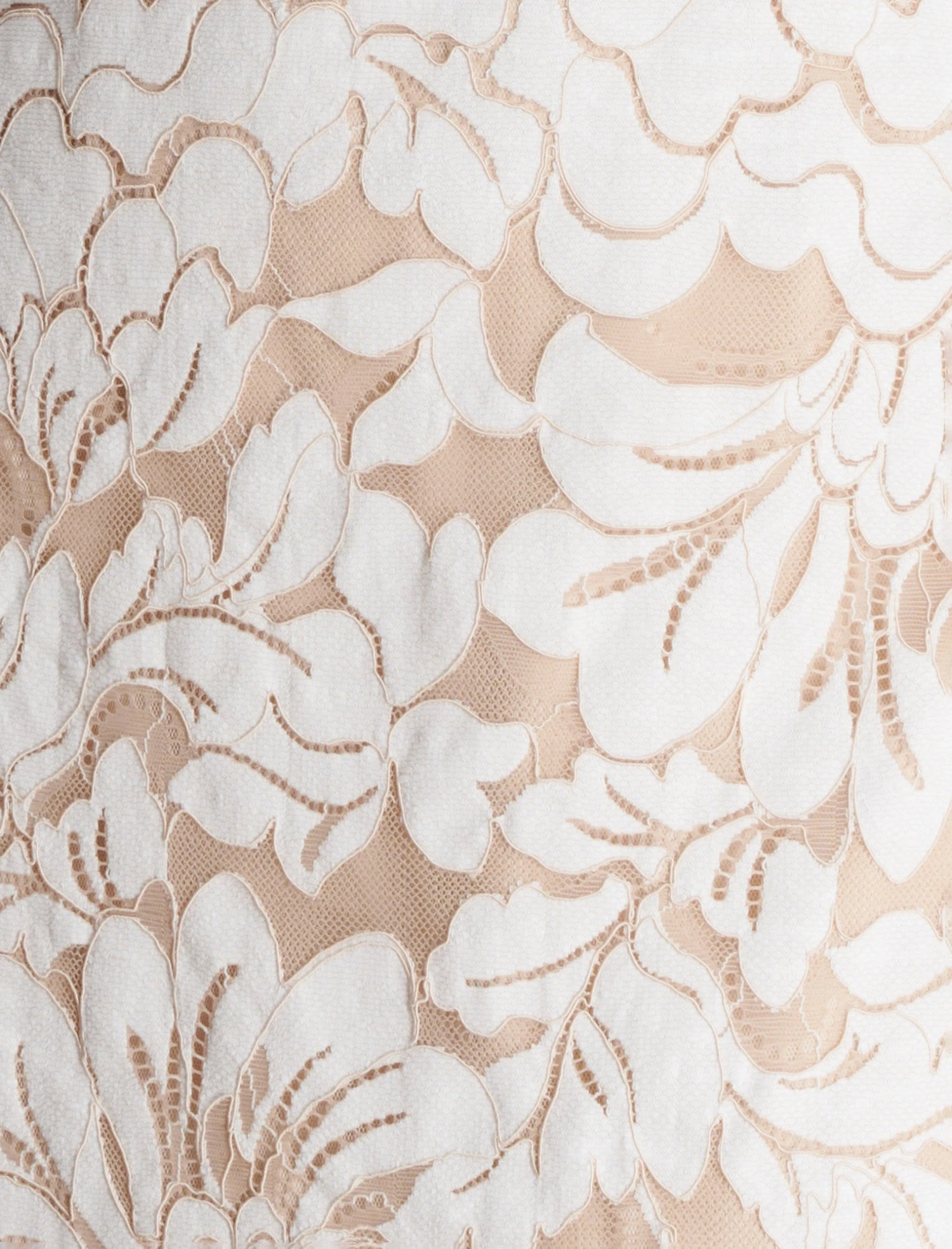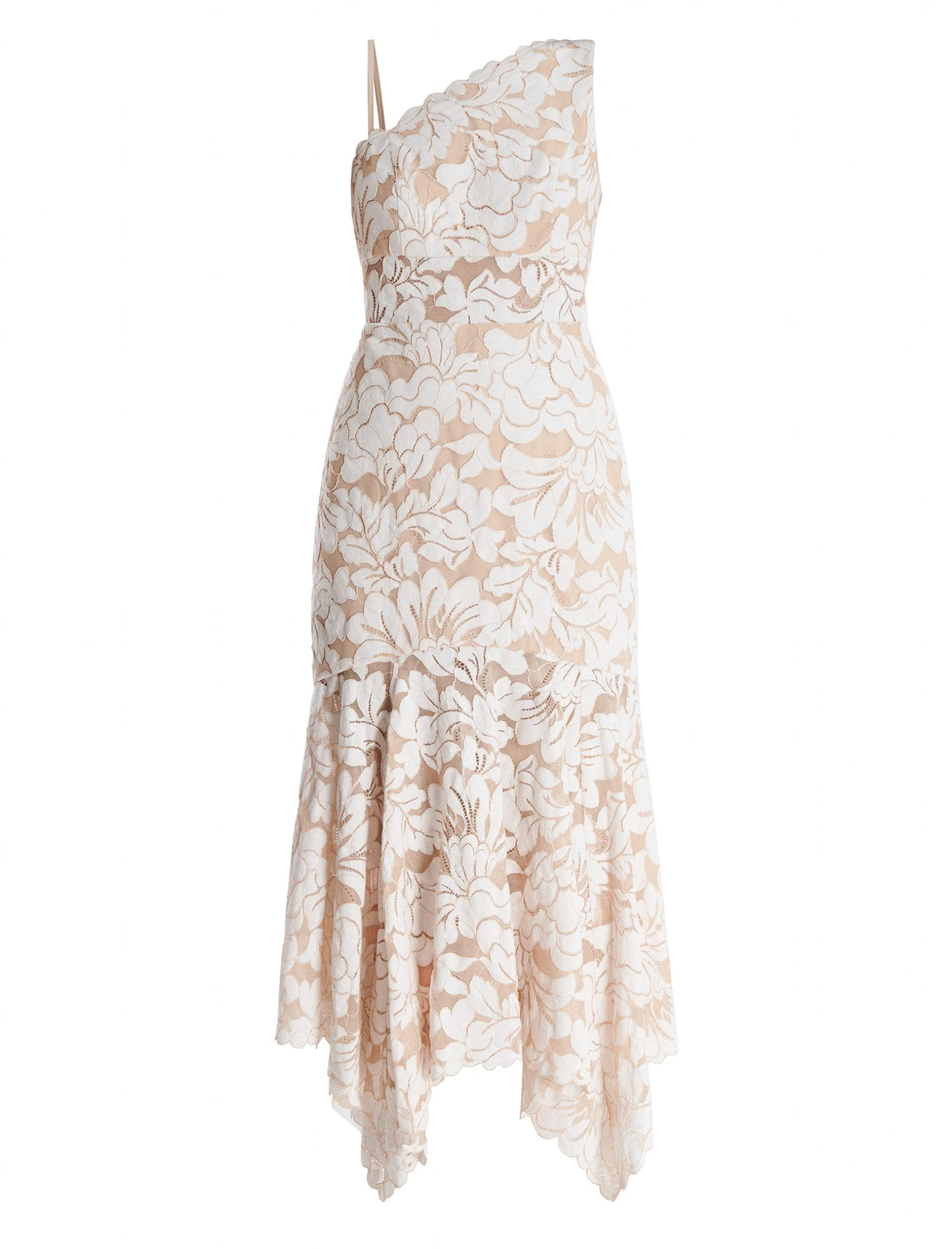 Romantic gown made from scalloped white lace with nude lining. Crafted with a one shoulder neckline and an adjustable removable shoulder strap. Cinched by a defined waistband and finished with a dreamy flounce handkerchief hem and hidden back zip.