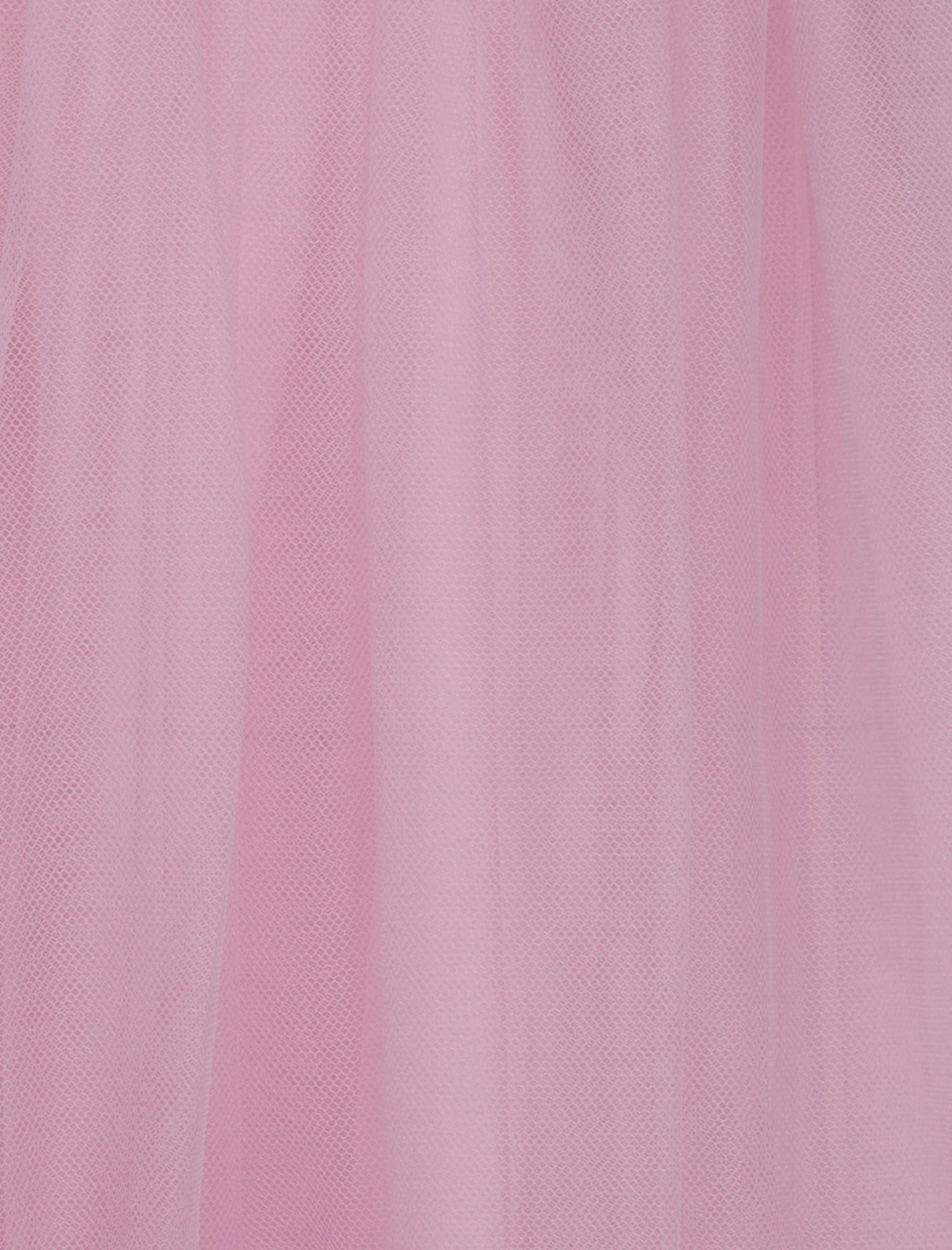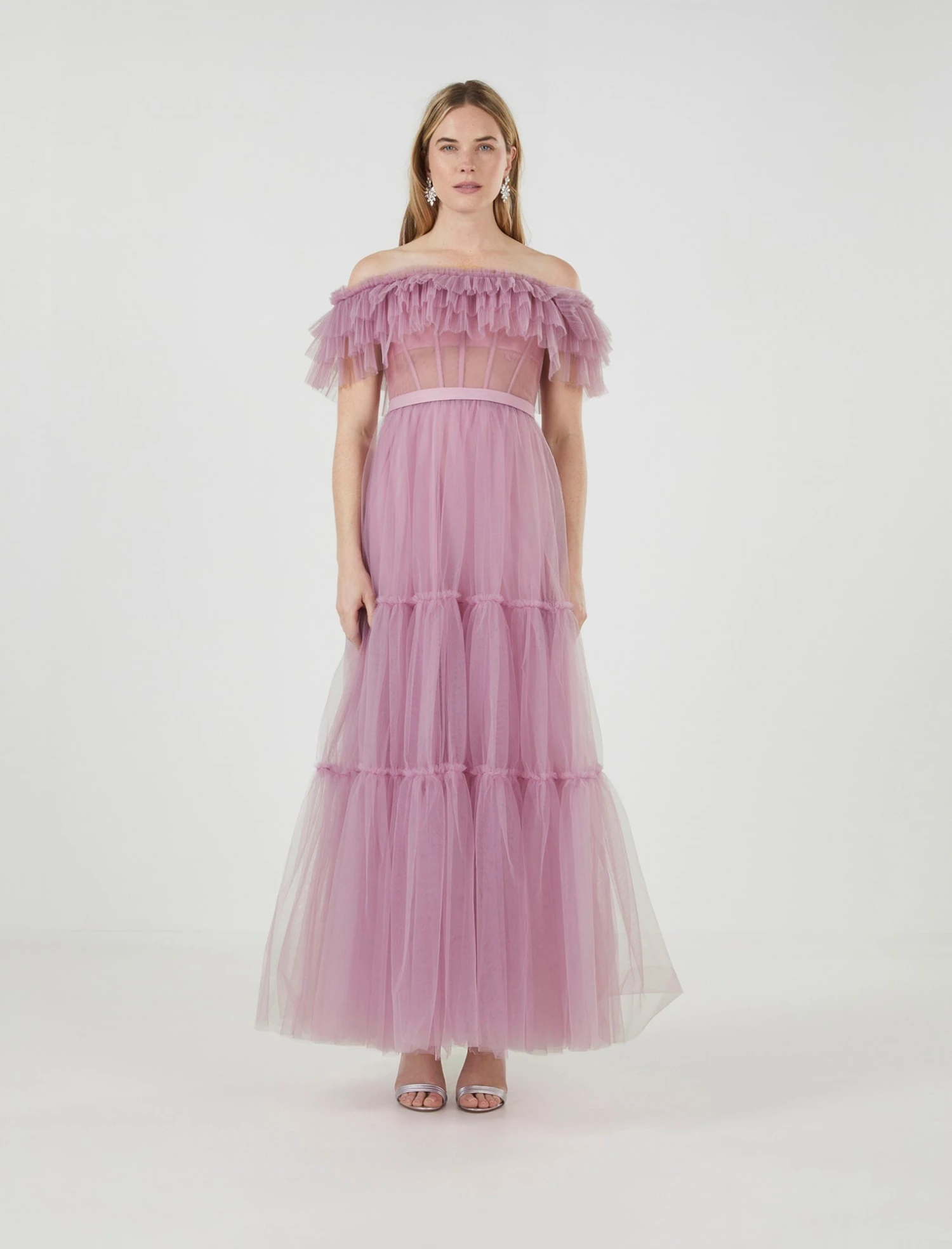 Romantic evening gown cut from lightweight tulle. Topped with a ruffled off-the-shoulder neckline and a sheer corset-style bodice. Finished in a fit-and-flare silhouette with a tiered skirt and a concealed back zip.