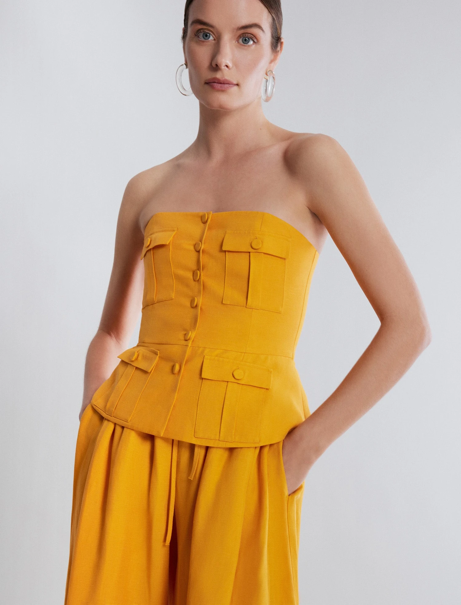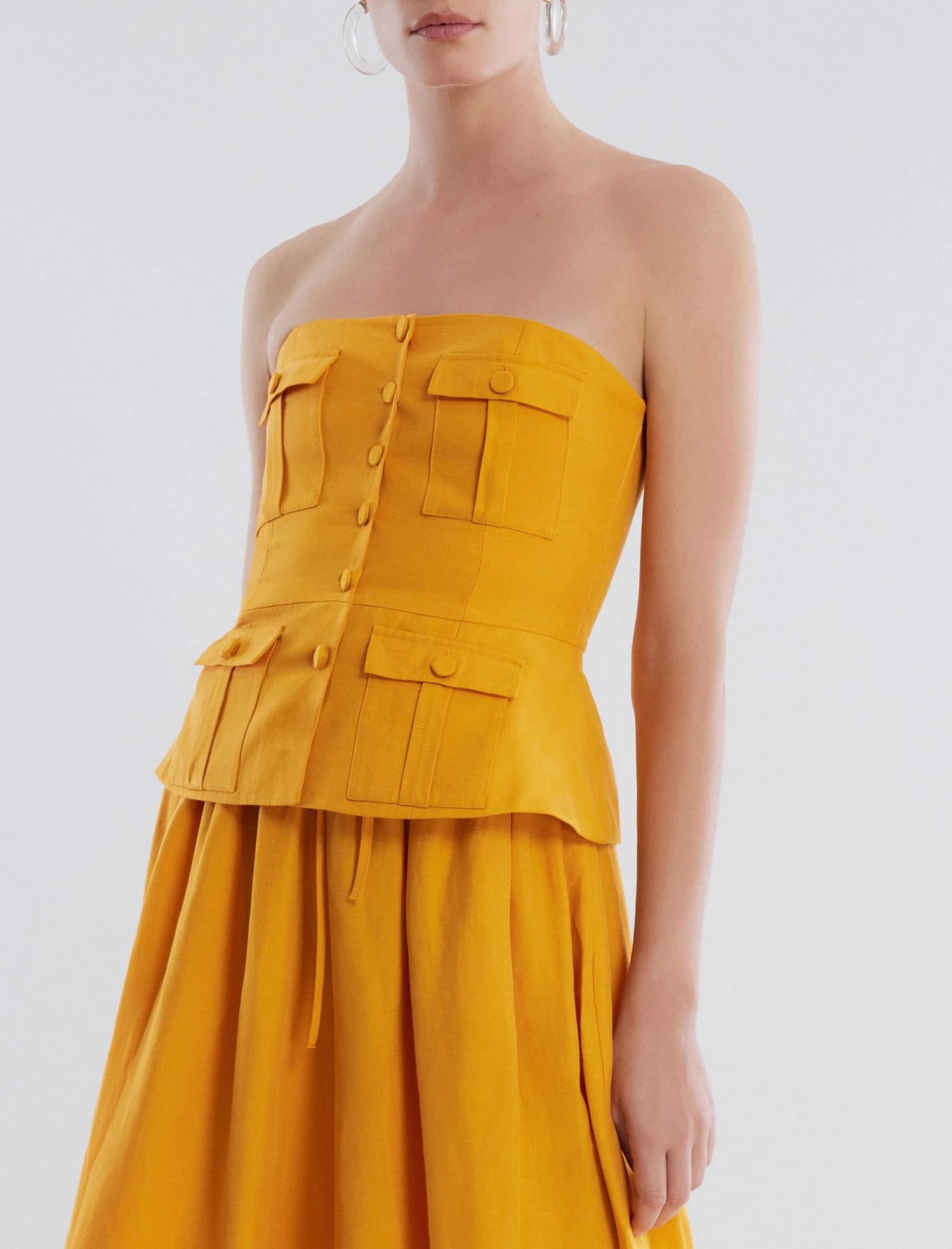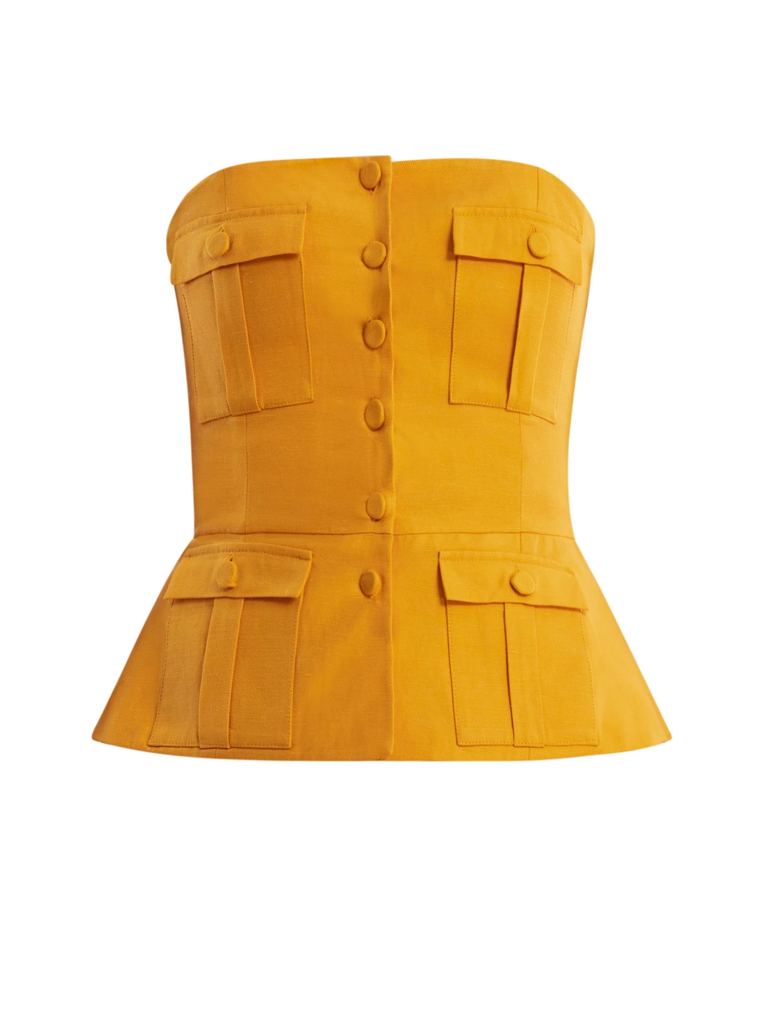 Stunning yellow peplum top made in a strapless design from a linen blend. Crafted with a peplum waist and bold button flap pockets throughout. Done with a fitted bodice with decorative front buttons and a hidden back zip.