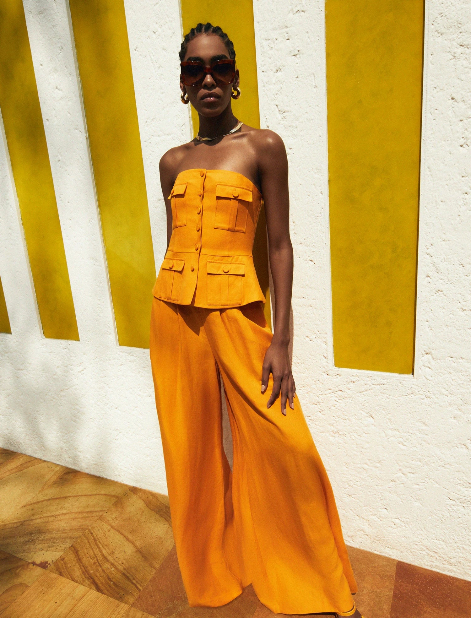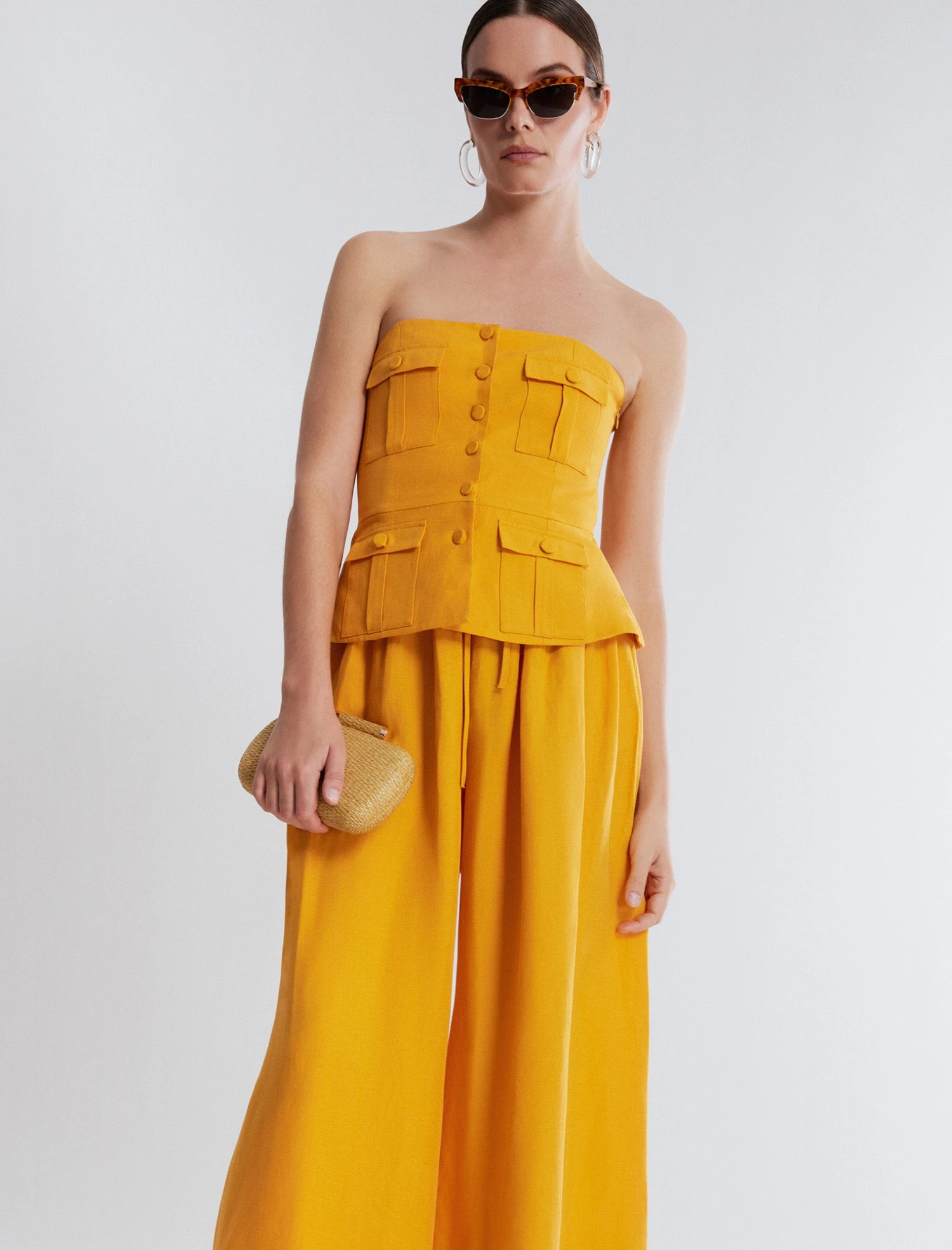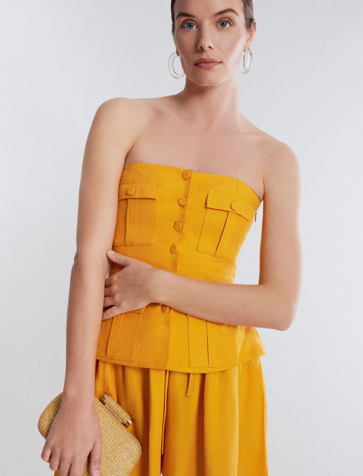 Stunning yellow peplum top made in a strapless design from a linen blend. Crafted with a peplum waist and bold button flap pockets throughout. Done with a fitted bodice with decorative front buttons and a hidden back zip.