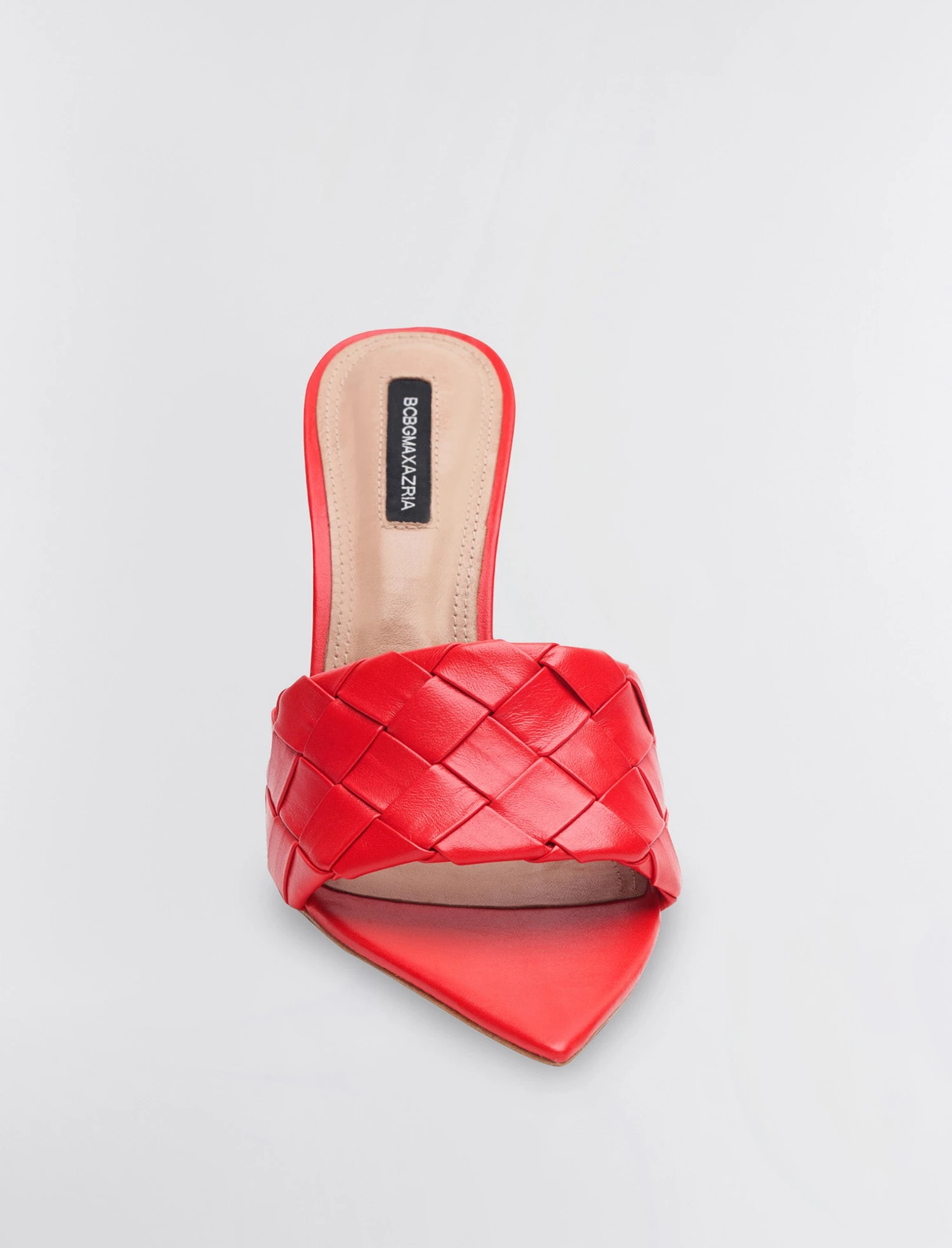 Slip-on mule sandal with an edge. Crafted from a braided weave leather. Designed with a pointed open toe and finished with a stiletto heel.