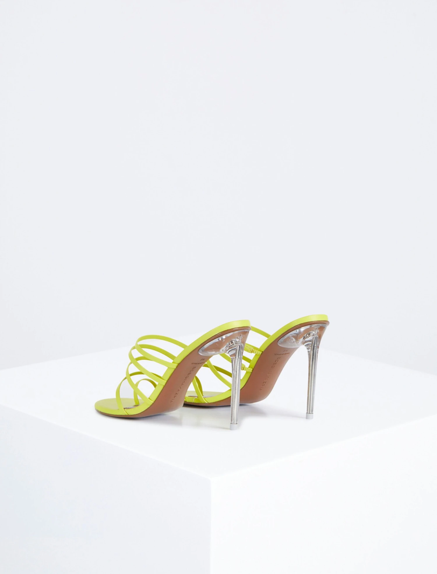 Sultry sandal crafted from leather in an effortless slip-on style. Made in a multi strap design with a toe loop. Finished with a sleek Lucite heel.