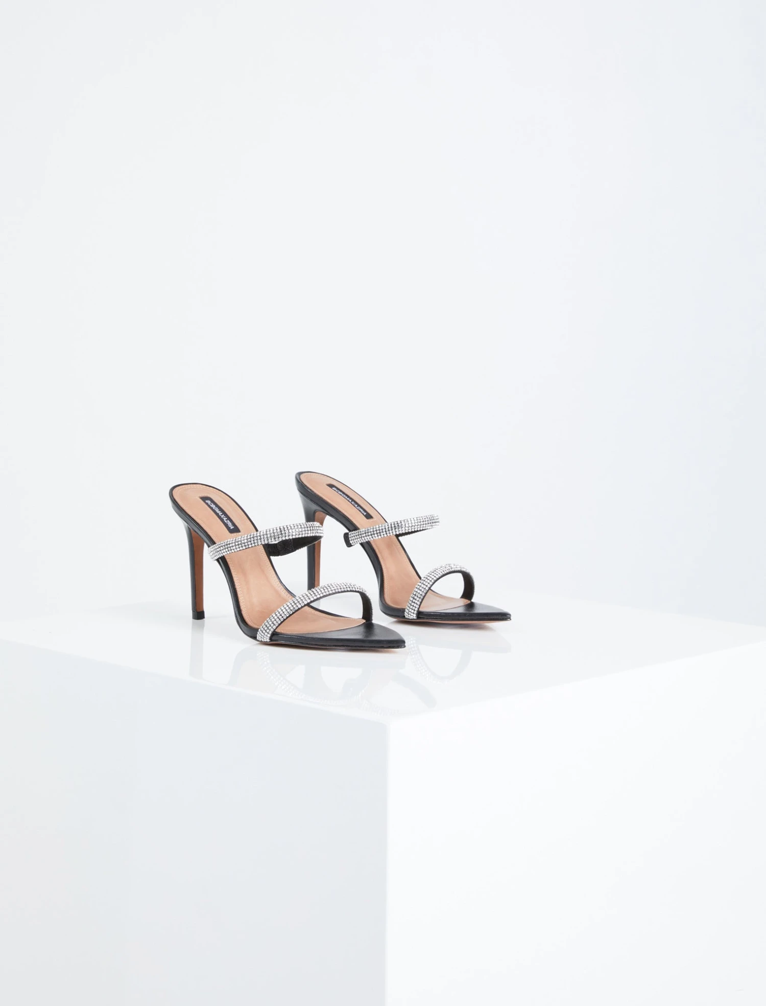 Stunning slip-on sandal with a bold pointed open toe. Embellished with shimmering rhinestones for a pop of sparkle. Finished with a sleek stiletto heel.