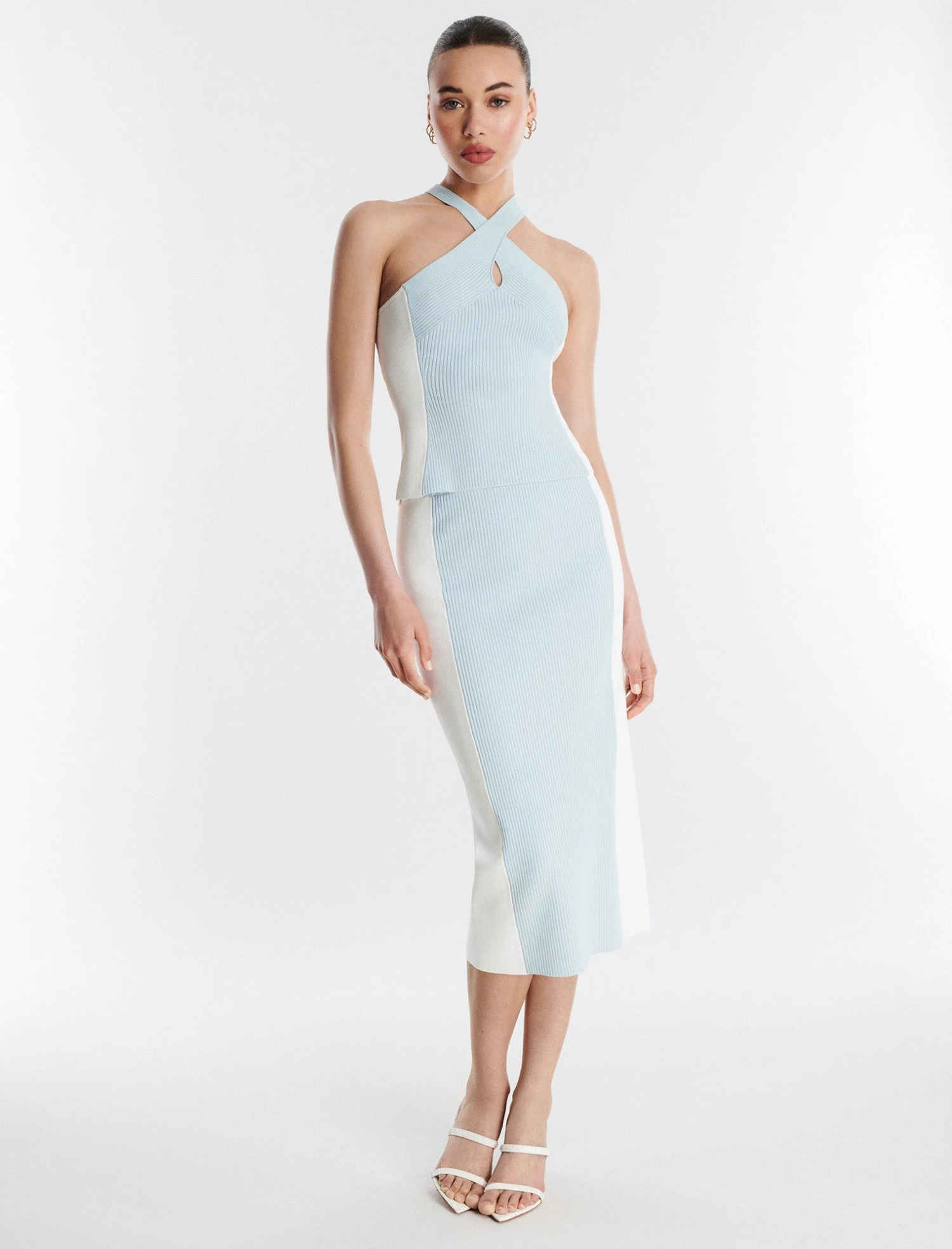 Bold light blue bodycon top done from a stretch knit in a pullover design. Crafted with crossover halter straps that create a natural keyhole detail. Complete in an elevated rib texture.