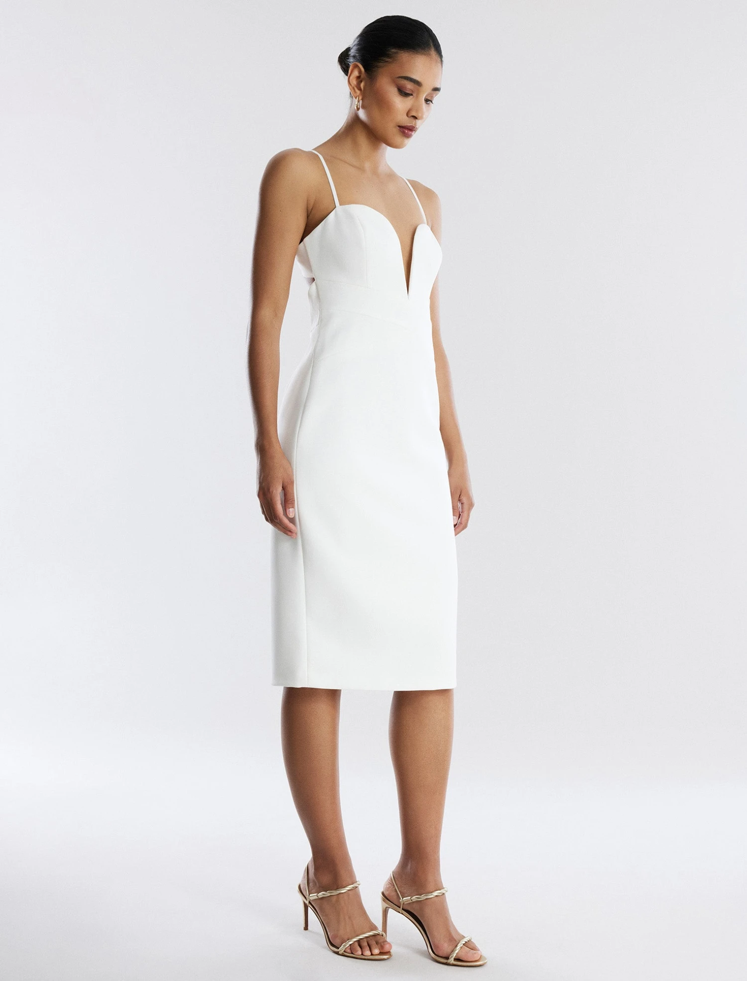 Head-turning off-white midi dress cut from stretch double face crepe. Done with a plunging sweetheart neckline and adjustable straps. Designed in a sheath style with a back cutout and back slit. Complete in a midi length that hits below the knee with a back zip and hook-and-bar closure.