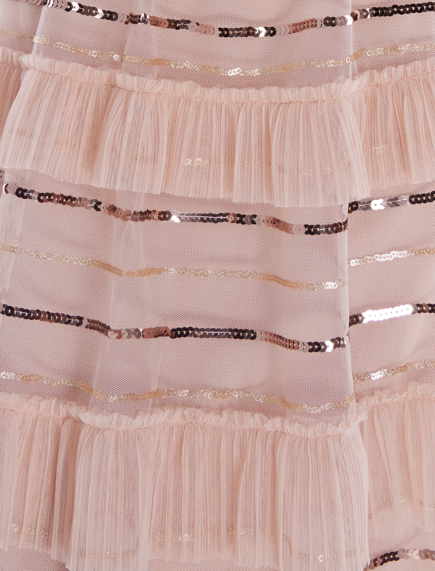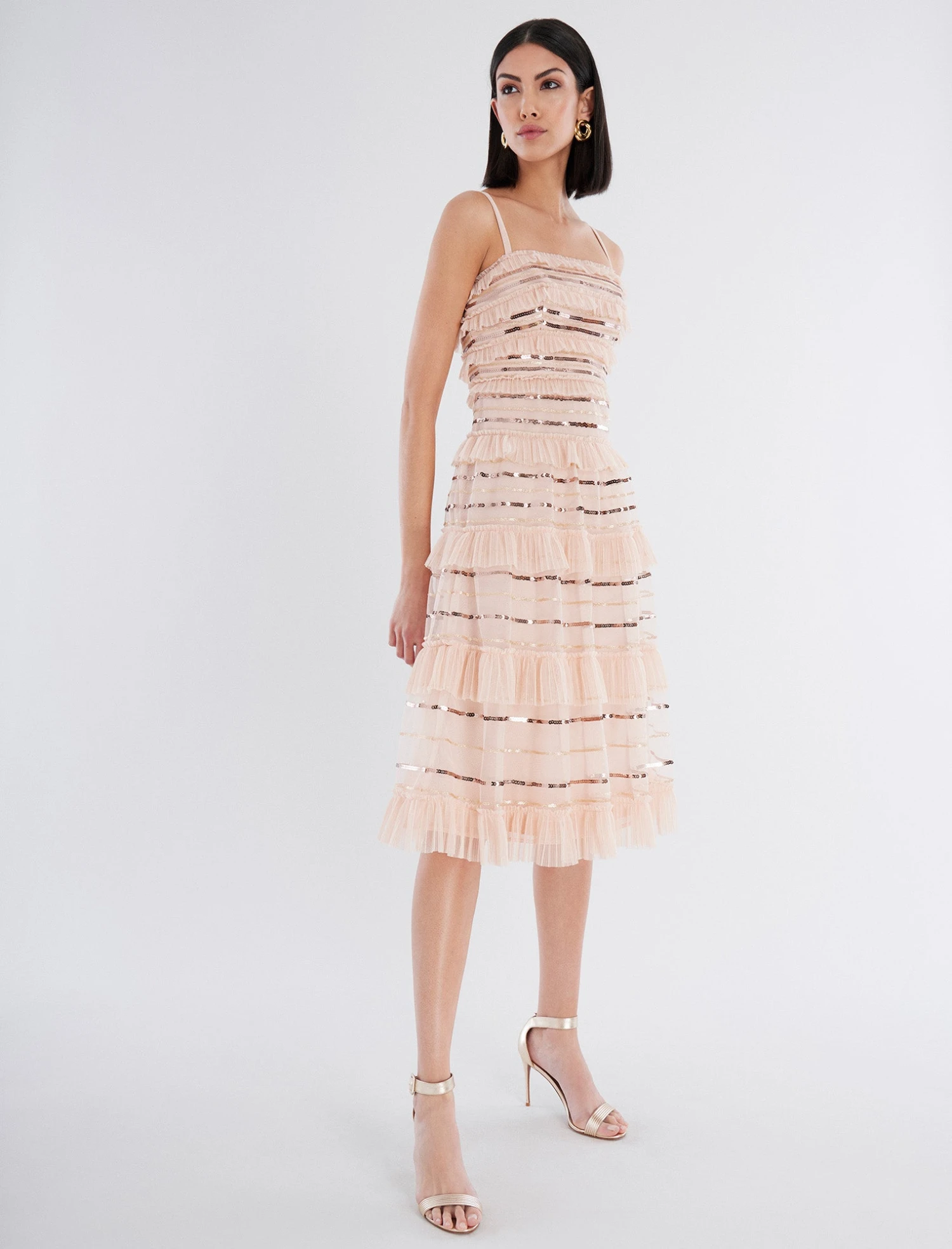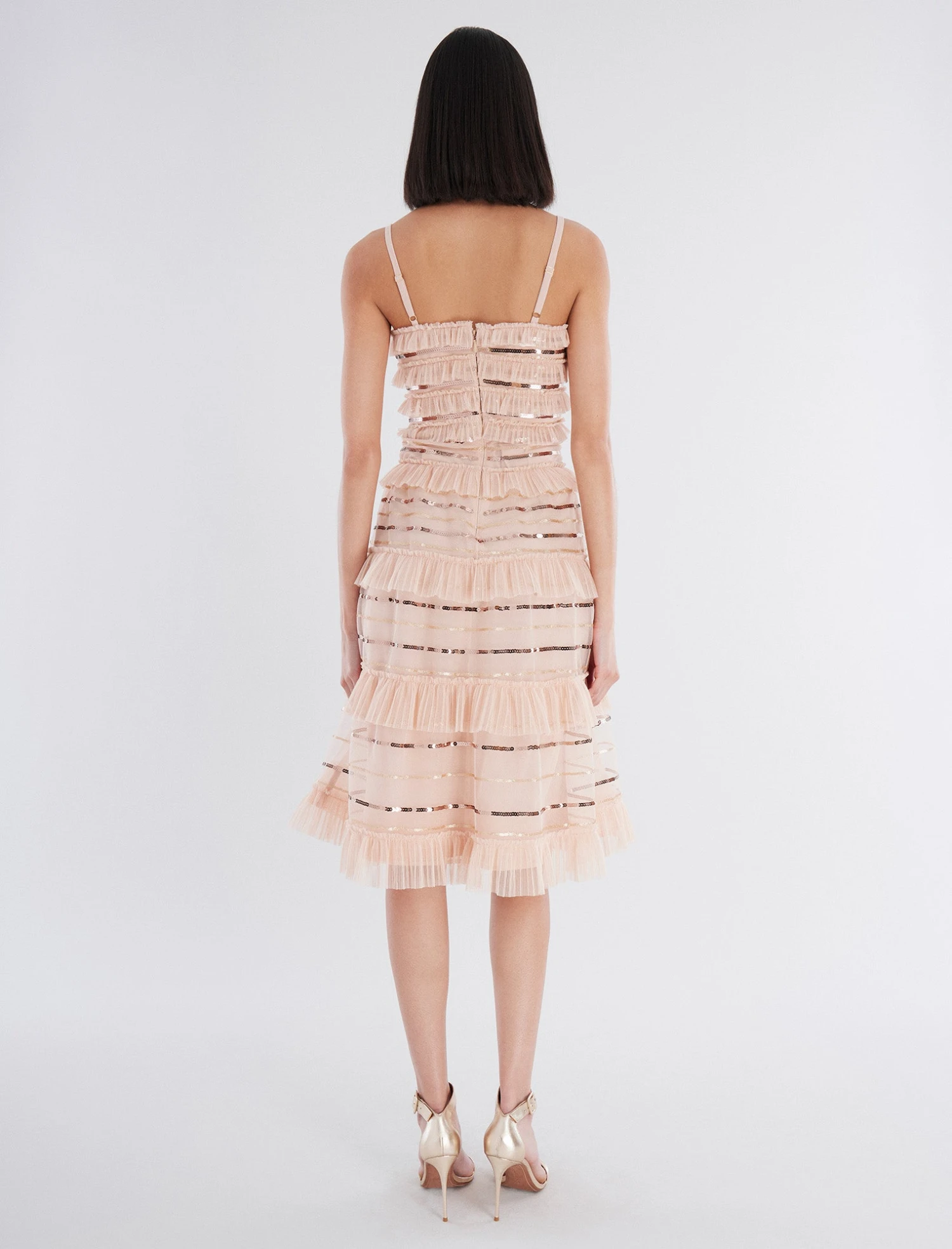 Eye-catching midi dress cut from sequin tulle with tiered pleated ruffles for a feminine finish. Topped with adjustable shoulder straps and complete with a secured back zip.