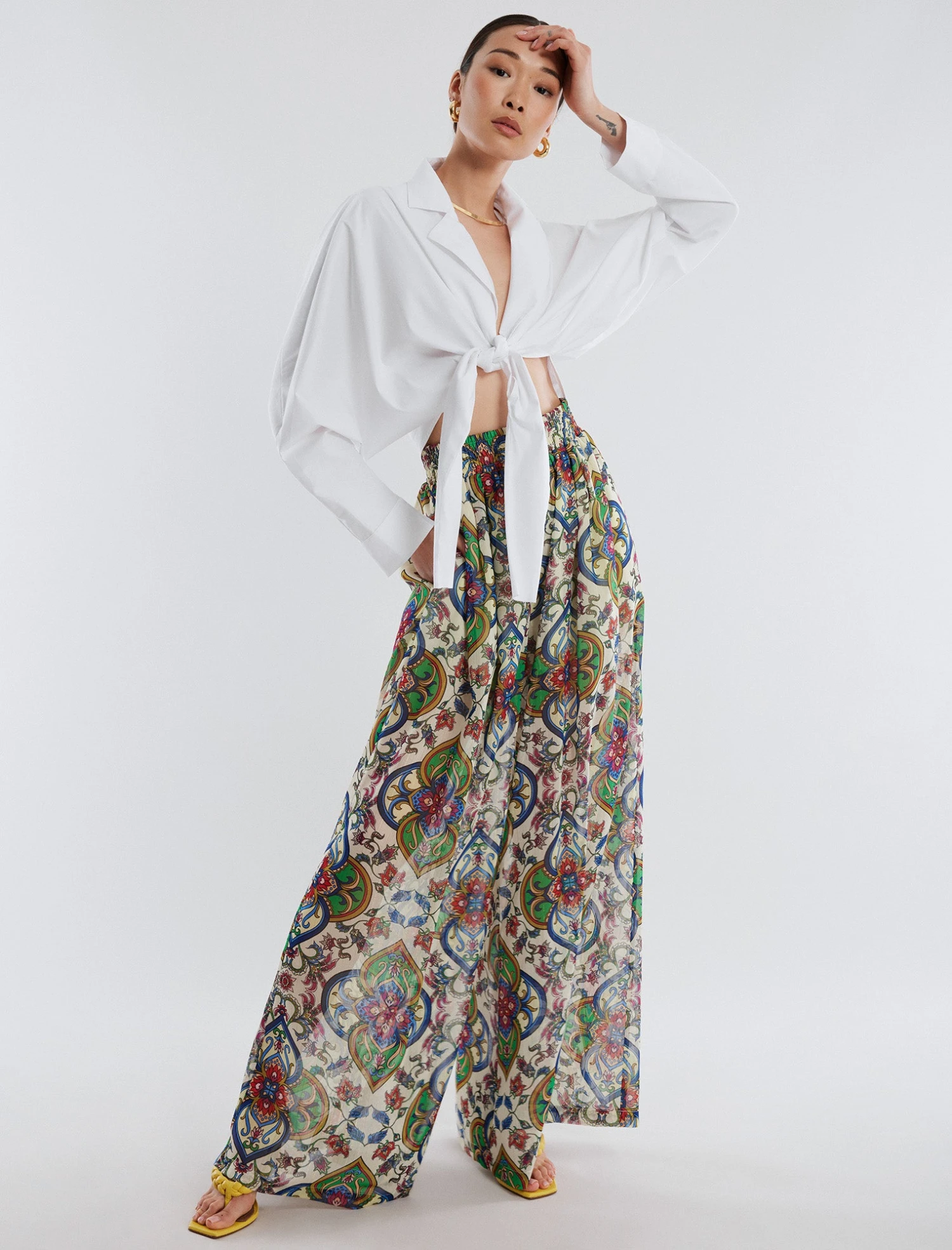Bold printed pant crafted from crinkled chiffon with a hint of metallic for subtle shine. Designed with a smocked stretch waistband and an oversized wide-leg for a chic finish.
