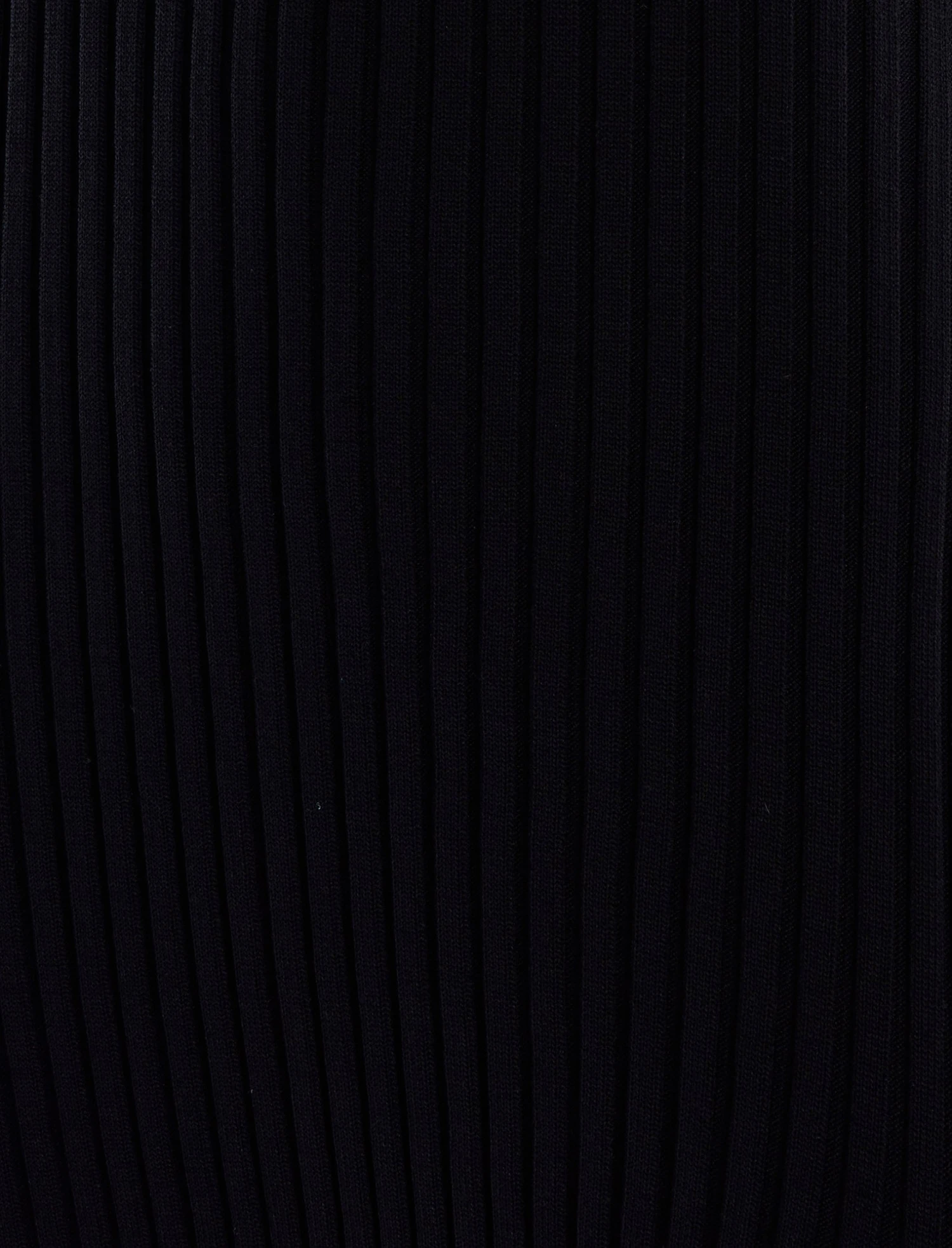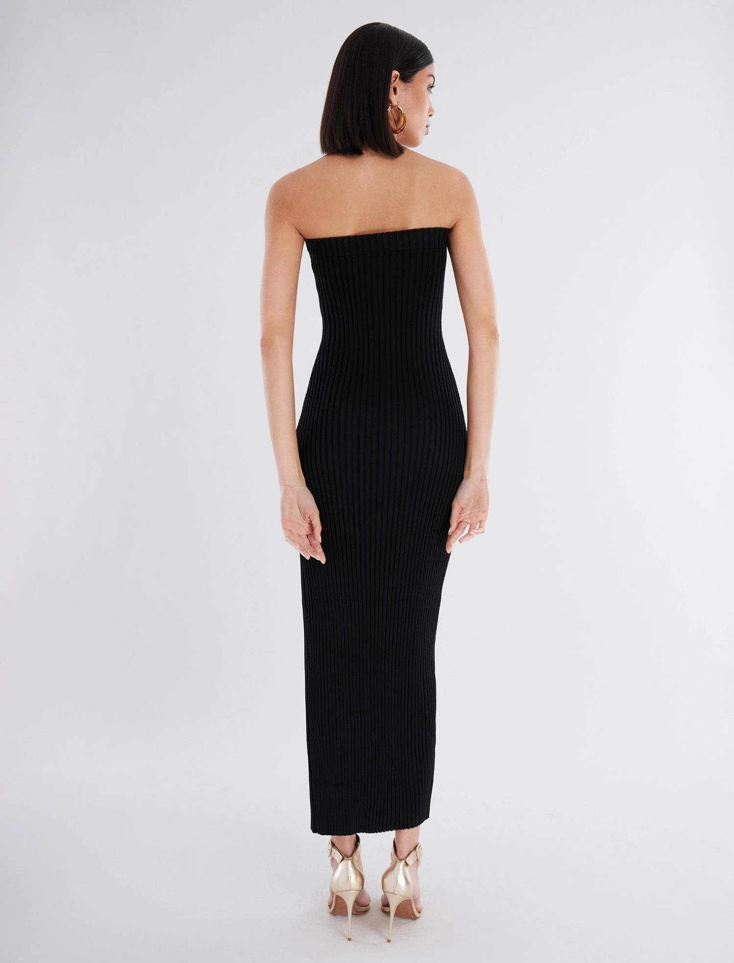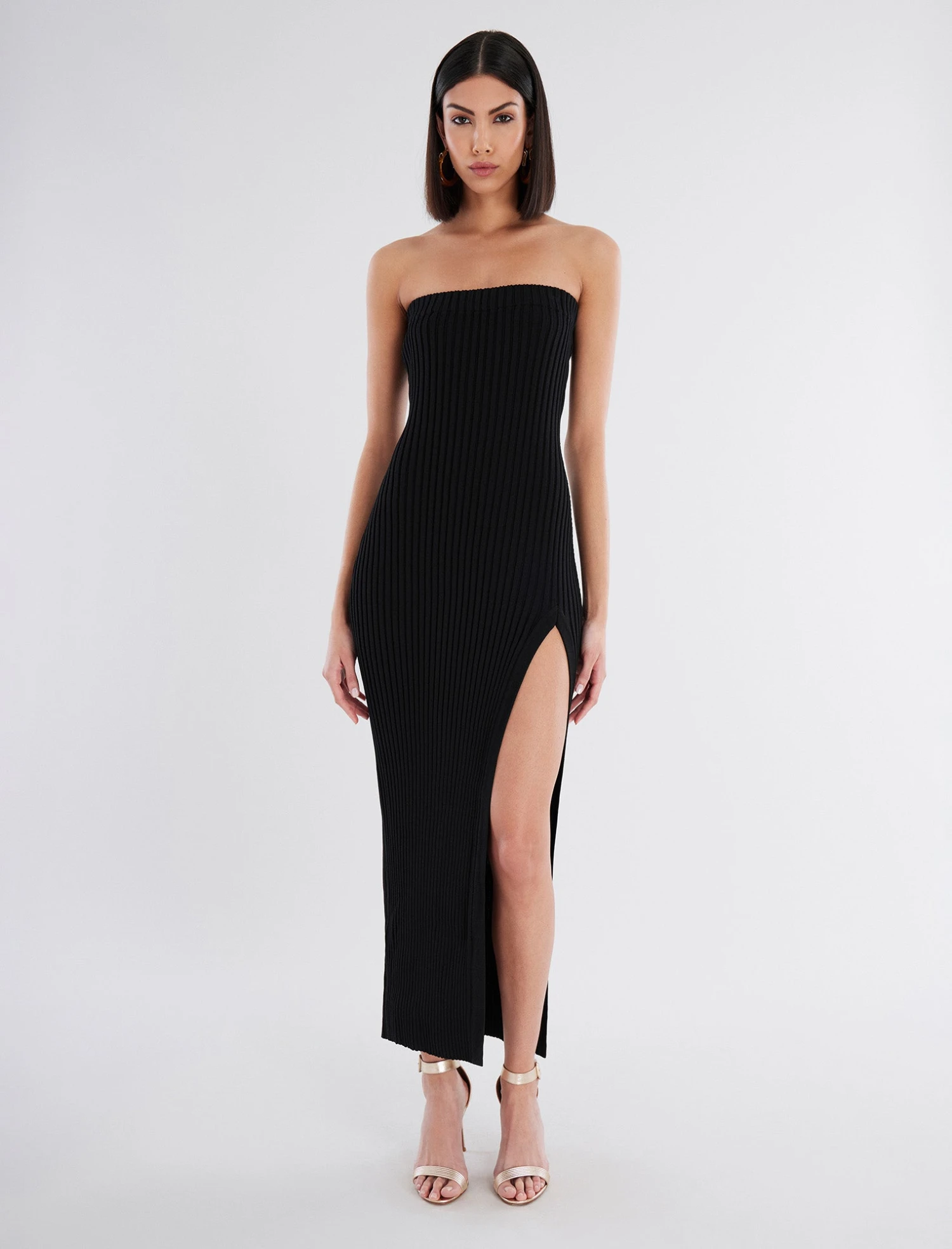 Sleek dress cut from a stretch ribbed fabric. Done with a strapless neckline in a bodycon silhouette. Finished with a bold front slit.