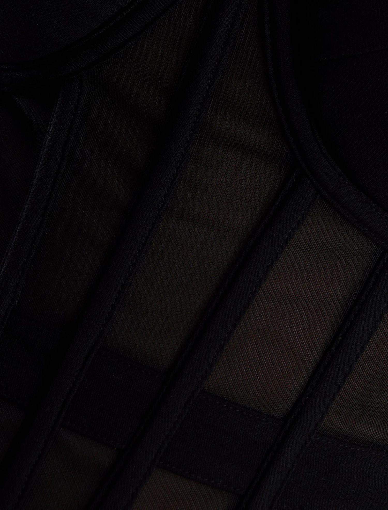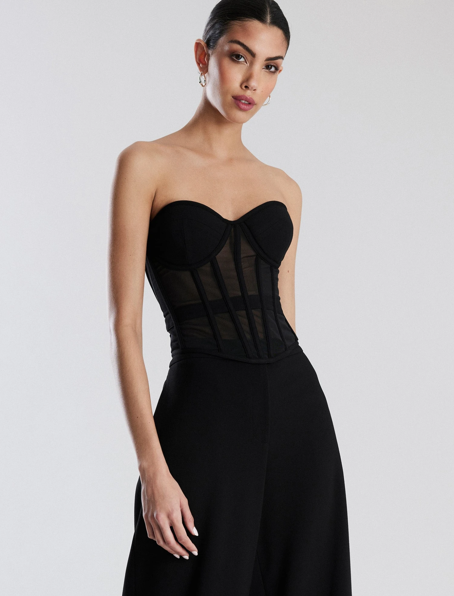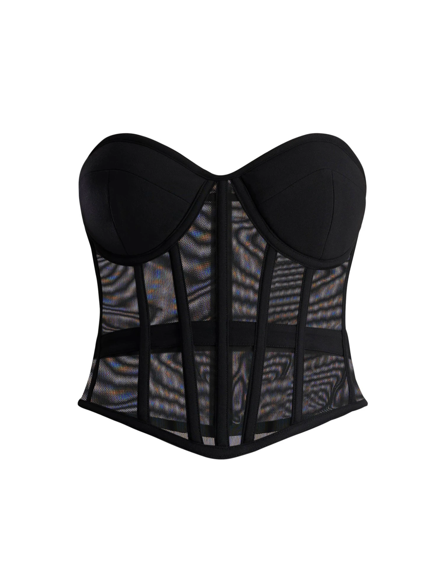 Stunning black form-fitting bustier top cut from mesh in a strapless silhouette. Done with a sweetheart neckline and a semi sheer boned bodice. Finished with an exposed back zipper closure.