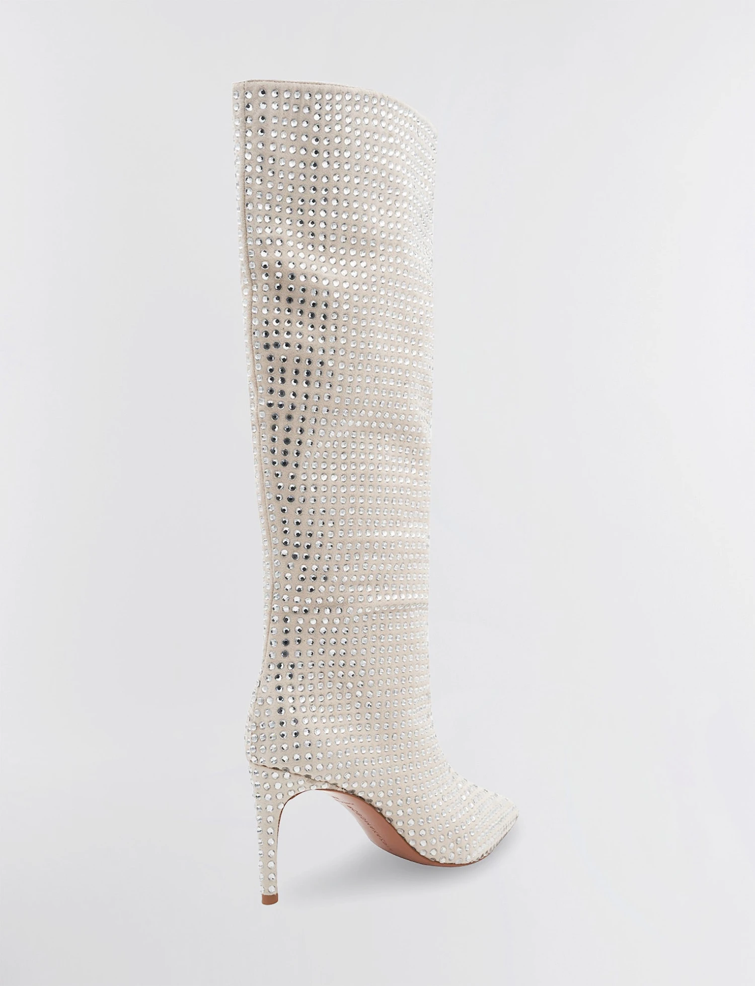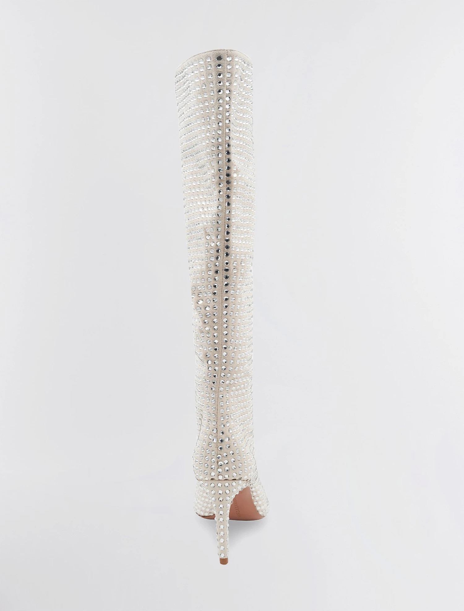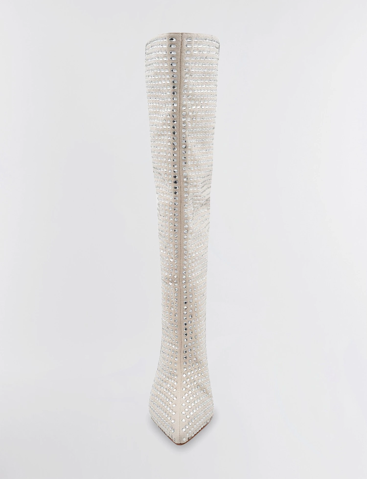 Striking tall high heeled boot with spectacular sparkle. Embellished with allover crystals on a classic pointed toe design. Finished with a sleek stiletto heel.