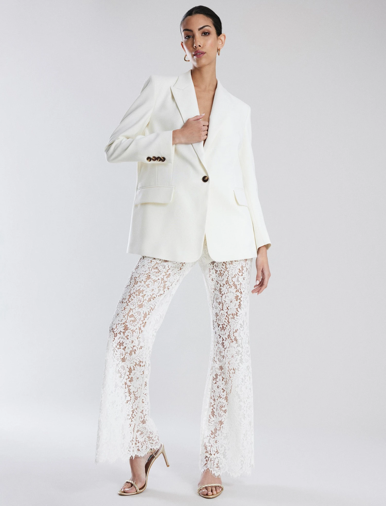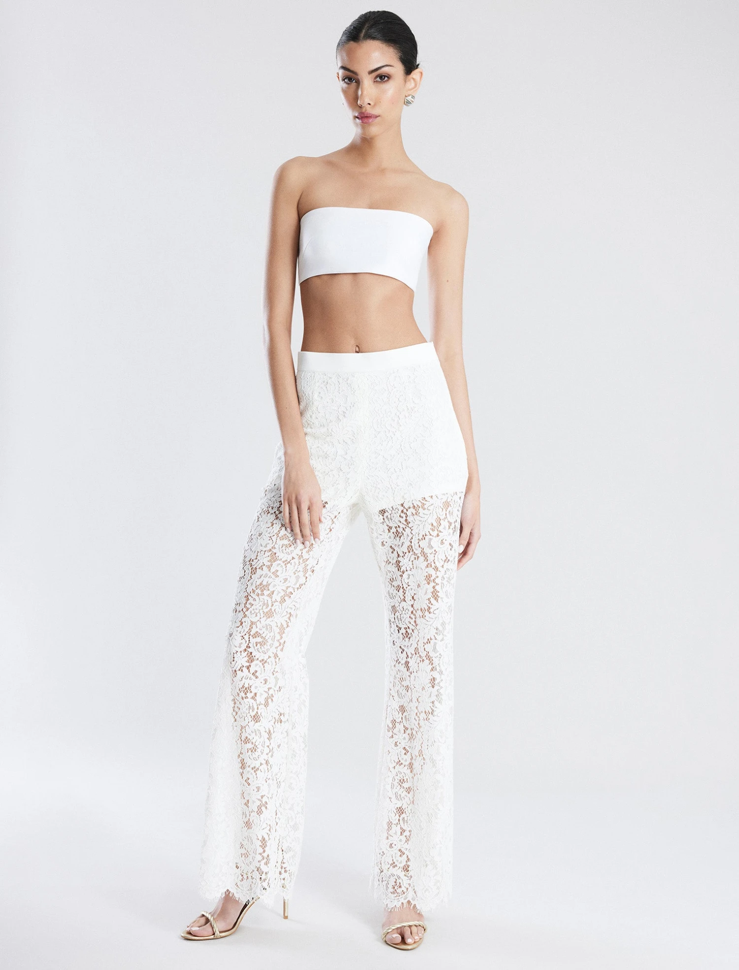 Playful white pant with a romantic mood. Cut from sheer corded lace with a flared leg and a beautiful scalloped hem. Finished with a built-in short lining and a hidden side zip closure.